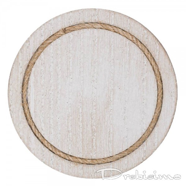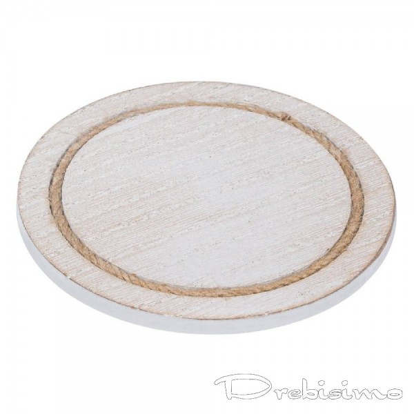 Стилизирана лятна дървена подложка за чаша, в бял цвят с естествена дървена текстура и вдлъбнат кант, в който е поставено бежово конопено въженце. Един красив и артистичен аксесоар, подходящ за деликатен подарък на приятели и любими хора. Дървената лятна подложка за чаша е с привличащ вниманието дизайн, добавящ настроение към сервирането на масата през лятото. Подходяща както за чашка кафе, така и за голяма чаша с домашна лимонада.
