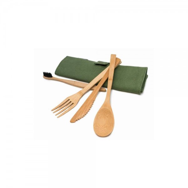Преносим комплект от 100% бамбукови прибори за хранене, състоящ се от нож, вилица, лъжица и четка за зъби. Комплектът се съхранява защитен в текстилен калъф за лесно, удобно и хигиенично пренасяне. Лек, лесен за съхранение, идеален за пътуване, офис, къмпинг или училище. Екологичен и издръжлив благодарение на 100% бамбуковия си състав. Комплектът прибори на Nerthus Ви е необходим, за да пренесете уюта на дома в училище, офиса или на разходка сред природата.