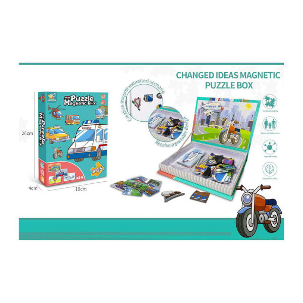 Книга-пъзел с магнитна дъска, която ще стимулира въображението и креативността у децата по забавен и занимателен начин. Тя съдържа 14 карти с превозни средства и 65 магнита с различни части от тях. Изберете една или повече карти, подберете точните елементи, за да сглобите правилно превозните средства от съответните карти и да получите красива картина.