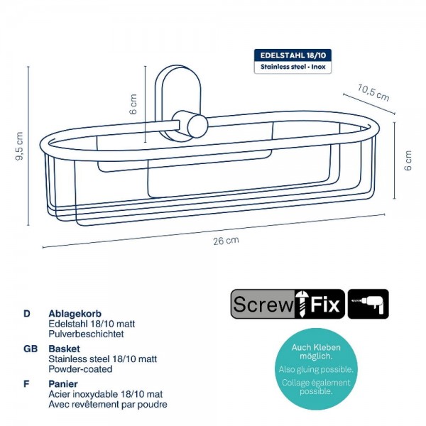 Внесете стил и изтънченост във вашата баня със аксесоарите от серия "Alessio": Разнообразни опции за монтаж: Можете да монтирате четката според вашите предпочитания. Включените в комплекта монтажни елементи позволяват лесно закрепване с помощта на винтове. Като алтернатива можете да използвате (предлага се отделно) лепило, за да закрепите стойката без пробиване.