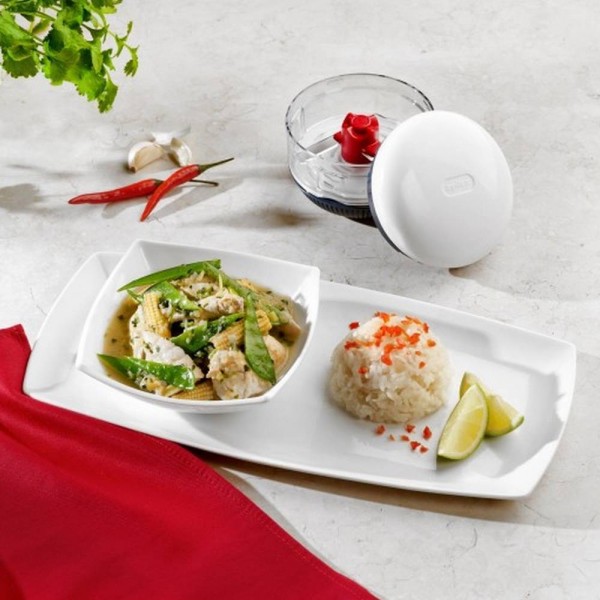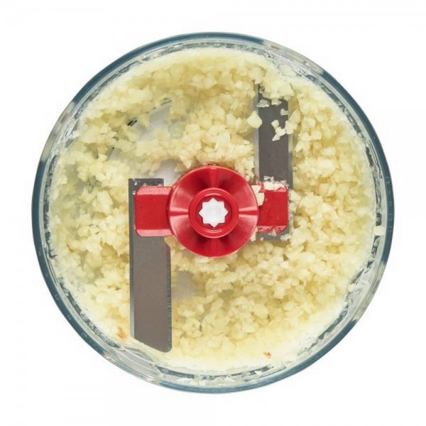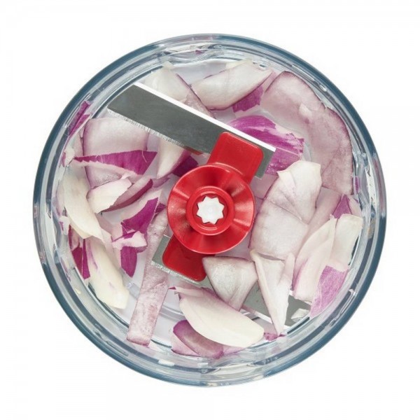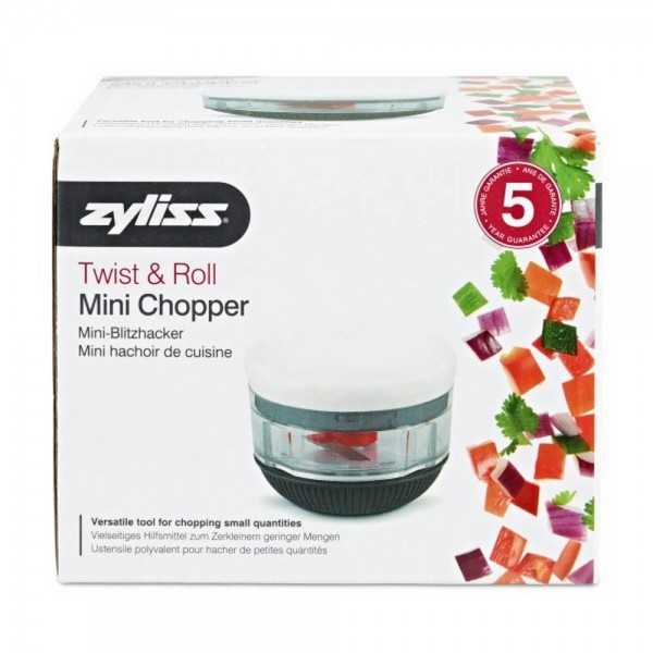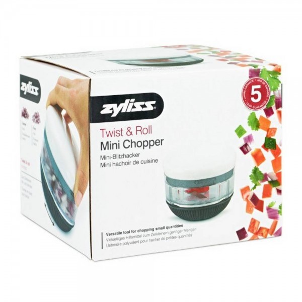 Мини чопърът Zyliss е проектиран специално за работа с малки храни като чесън,лук,чушки, джинджифил, билки, листни подправки и други. Двустранните остриета се активират чрез навиване на гумената основа по работна повърхност или с навиване с ръка. Тя ви дава пълен контрол върху резултатите - просто търкаляйте повече, за да получите по-фини резултати или по-малко за по-груби резултати.