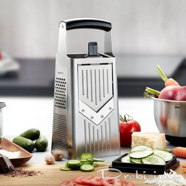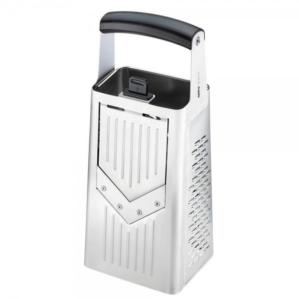 - Двустранна настъргавща повърхност за нежни люспи от твърдо сирене, зеленчуци и шоколад;