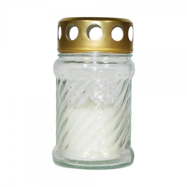 Тази елегантна бяла свещ е изработена от висококачествен парафин и поставена в здрава стъклена чаша с красив златист капак с декоративни отвори. Конструкцията осигурява равномерно изгаряне и защита на пламъка от вятър, което прави свещта подходяща както за закрити помещения, така и за открито пространство.