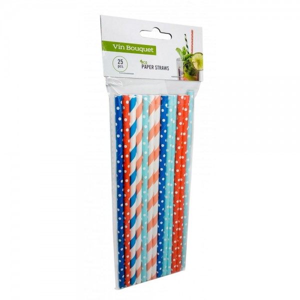 Комплект хартиени сламки за еднократна употреба 25 броя по 19,5 см. по дължина, идеални за коктейли, млечни шейкове, безалкохолни напитки и всякакви други напитки. Подходящи са както за домашна, така и за професионална употреба. 5 различни оригинални дизайна във всяка опаковка.