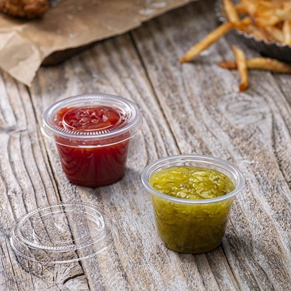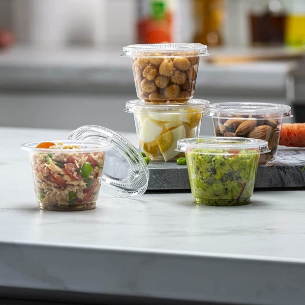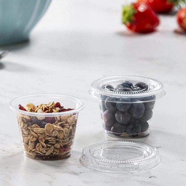 Елегантни малки прозрачни контейнерчета с капаче, за еднократна употреба. Подходящи за порционно разпределяне на сосове, дресинги, салати, зърнени продукти, десерти, дребни плодове. Плоските капачета ефективно защитават храната и запазват нейната свежест, а стилната форма е специалоно проектирана да презентира вашите вкусни и пресни хранителни продукти. Купичките са подходящи и за пренасяне на малки количества храна за междинно похапване.