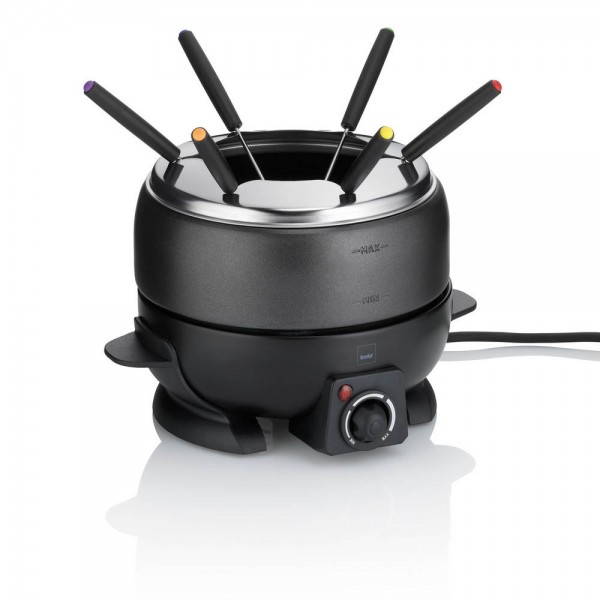 Няма значение дали харесвате фондю с масло, сирене или месо или предпочитате шоколадово фондю с плодове - електрическото фондю Simplon е наистина универсално. Опасностите и усилията, свързани с фондюто, също са сведени до минимум, което е положителен аспект, когато децата са на масата. И вече не е необходима периодичната подмяна на горивна паста. Друго предимство е, че можете да регулирате температурата на това фондю индивидуално и по всяко време, както пожелаете, контролната лампа помага за това. В комплекта, разбира се, са включени предпазител от неръждаема стомана и 6 вилици за фондю от неръждаема стомана с пластмасови дръжки. Тенджерата е изработена от стомана с незалепващо покритие.