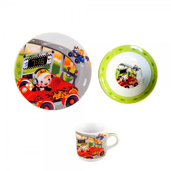 Красив порцеланов сервиз, с изобразен млад състезател в спортна кола. Нека и Вашият състезател се бори винаги за първото място във всички житейски състезания. Елементите от сервиза са красиво изрисувани и прилежно опаковани в прекрасна подаръчна кутия. Подходящ подарък за детски рождени дни, кръщенета и др.