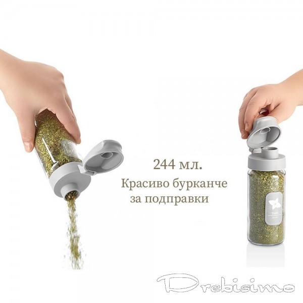 Бурканчетата за подправки на Hane са абсолютно задължителни за всяка модерна домакиня. Те са не само практична алтернатива за организиране и свежо съхранение на билки и подправки, но и приятно допълнение към декора на вашата кухня. Всяко бурканче е с вместимост 244 мл, изработено от стъкло, с пластмасово капаче с винтово затваряне и широк отвор за поръсване. Бурканчето може да се използва самостоятелно за съхранение на дребни бонбончета, шоколадови или захарни пръчици за декорация на сладкиши. Освен това можете да направите сет за подправки от няколко бурканчета за да е кухненския плот по-красив и функционален, а овкусяването при готвене истинско удоволствие.
