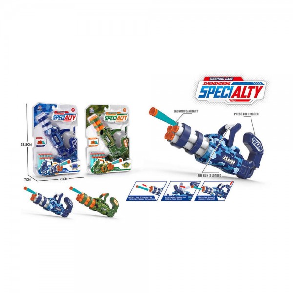 Детско пластмасово оръжие с атрактивна форма, което всеки малък войник ще оцени подобаващо. Поставете стреличките от пяна в петорната цев, дръпнете ръчката, за да заредите, натиснете спусъка. Готови сте да се хвърлите в боя!