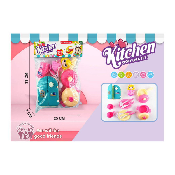 Детски кухненски комплект за игра с малка кукла фея, тенджера, тиган, 2 чинийки, 2 чашки, 4 прибора за готвене, хладилник. Подходящо за момичета над 3 години.
