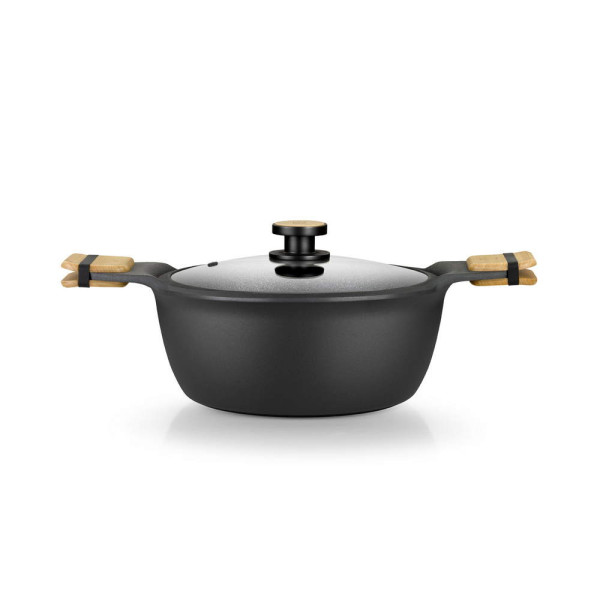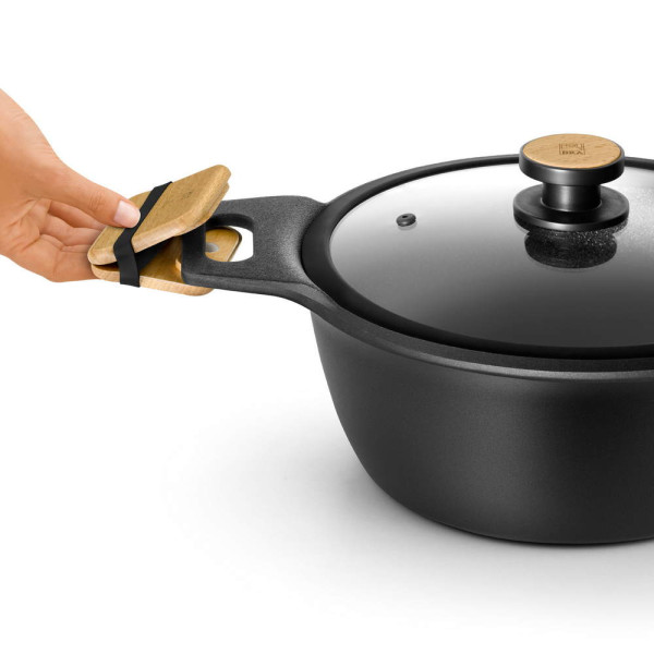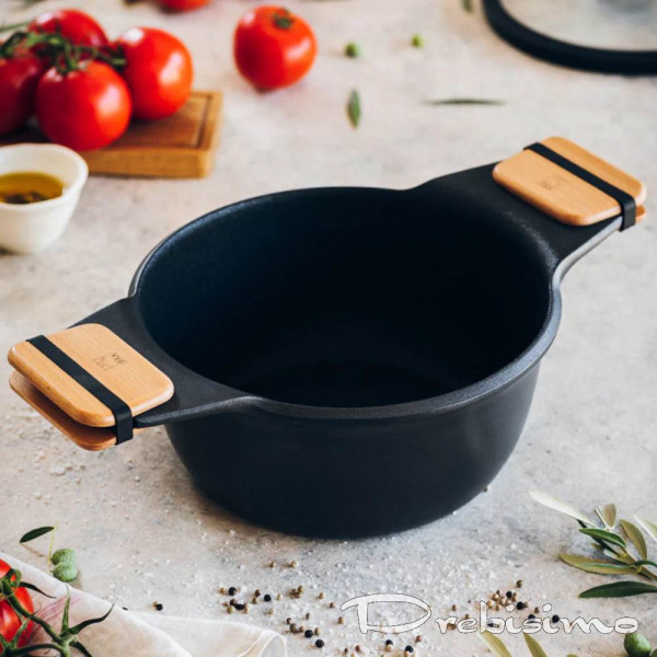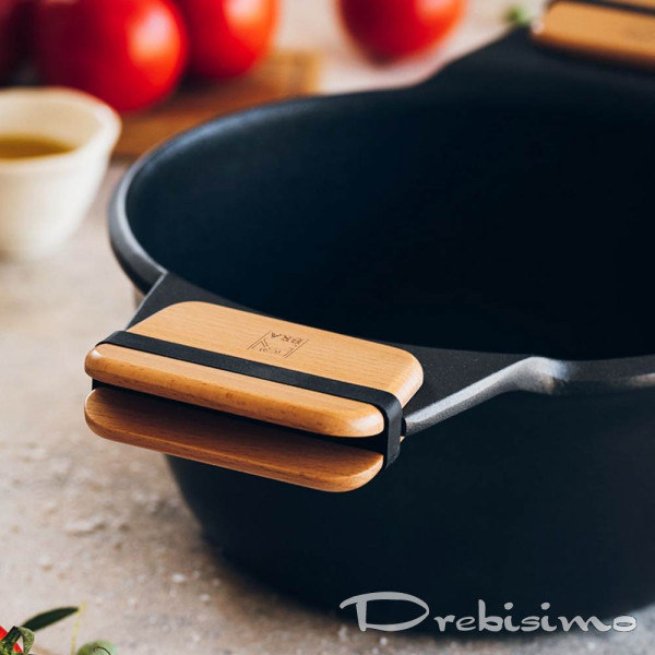 Черна тенджера от лят алуминий с допълнителни дръжки от бук