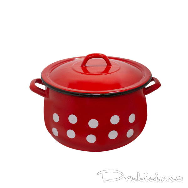 Описание на 20 см (4,5 л.) емайлирана тенджера с метален капак разцветка Бели точки на червен фон: