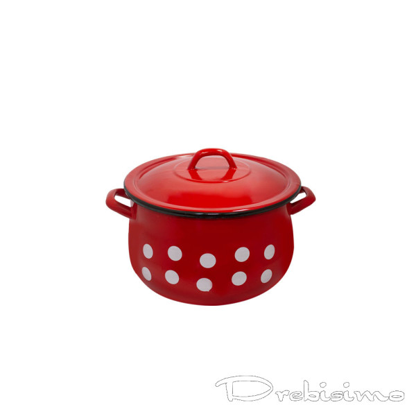 Описание на 16 см (2,3 л.) емайлирана тенджера с метален капак разцветка Бели точки на червен фон: