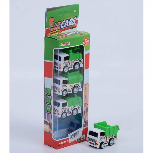 Комплект от 4 малки специализирани машини за извършване на различни дейности – камион с кран, цистерна, боклукчийски камион и самосвал. Превозните средства притежават pull back механизъм, а това ще направи играта още по-завладяваща! Комплектът е подходящ за самостоятелни забавления и весели игри с приятели.