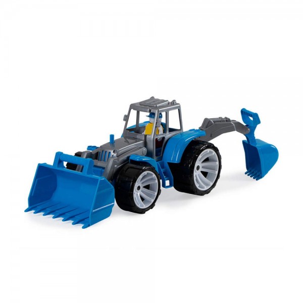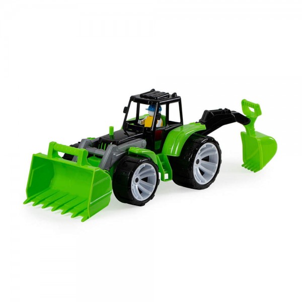 Мултифункционална машина 2 в 1 за извършване на различни строителни и селскостопански дейности – трактор с челен товарач и багер. Играчката притежава просторна кабина с човече шофьор, масивни гуми с грайфер за безпрепятствено движение по всякакъв вид трасе, и 2 кофи. Кофата за изкоп е подвижна и можете да я откачите, когато нямате нужда от нея. Забавлявайте се у дома, в парка, в детската градина и дори на плажа – висококачествената пластмаса няма да избледнее под жарките слънчеви лъчи! Опаковка: мрежа.