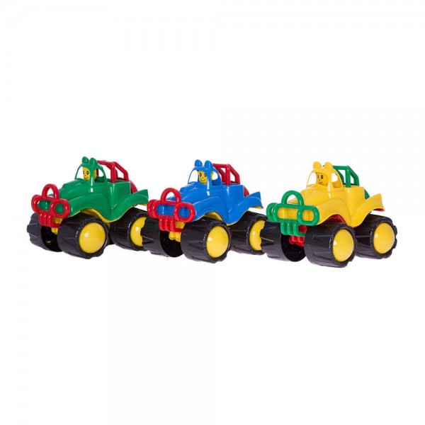 Малък пластмасов джип с шофьор, шарен и забавен. Благодарение на масивните си гуми и високото окачване, колата ще премине с лекота по всякакъв вид трасе. А устойчивият материал, от който е изработена, в цветове, които не избледняват от слънцето, позволява интензивно използване у дома, на плажа, в парка, а защо не и в снега!