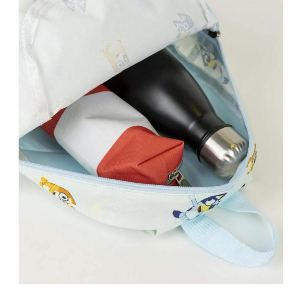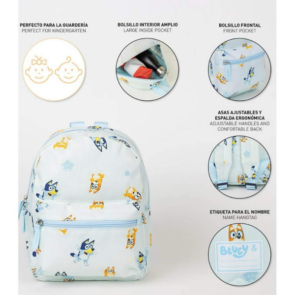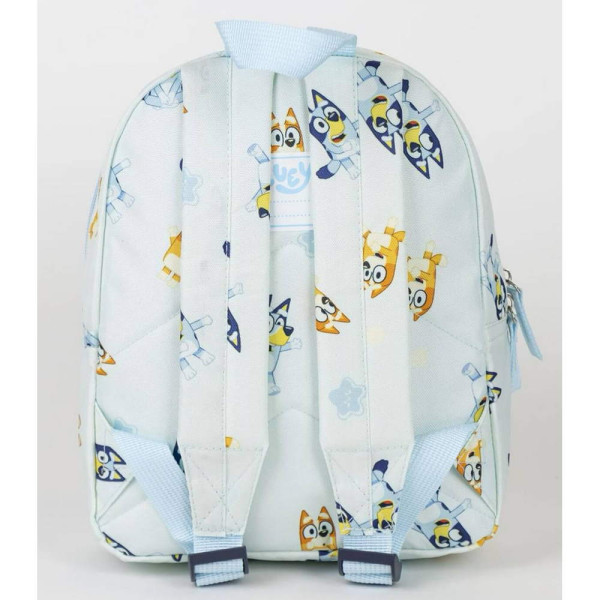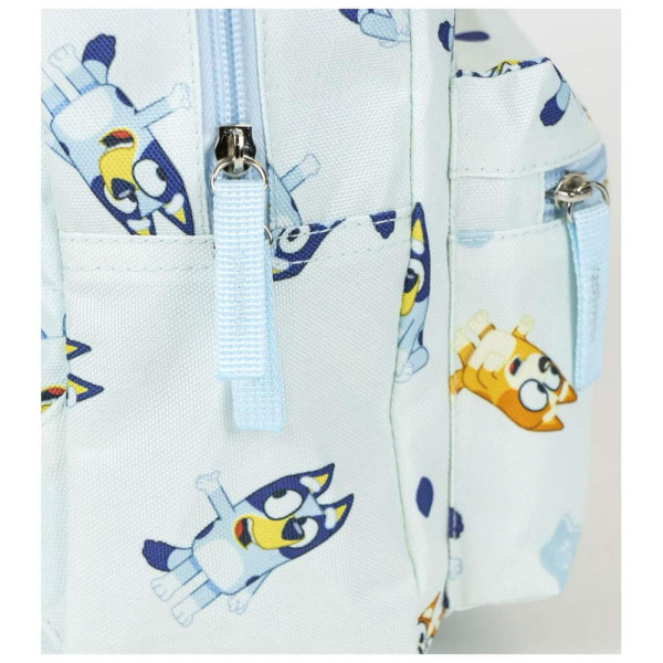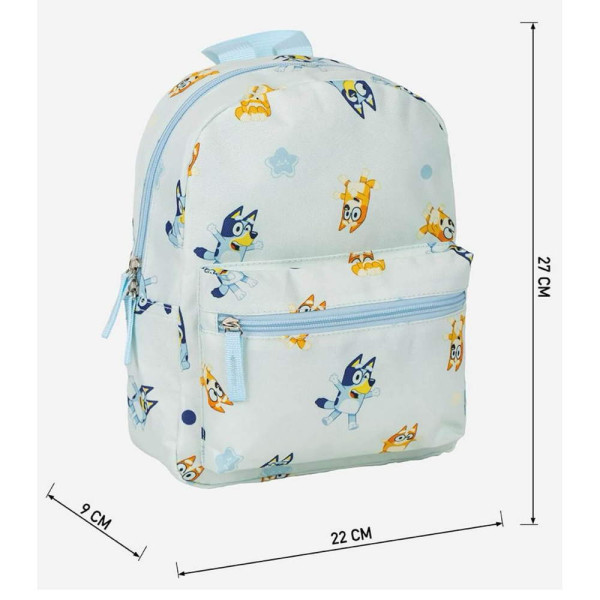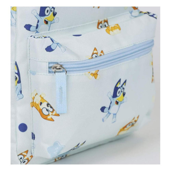Раница за детска градина Блуи, изработена по европейски дизайн, на испанския производител Cerda. С едно основно отделение с двоен цип, преден джоб с цип, подплатен гръб, подплатени регулируеми презрамки и дръжка за носене в ръка. Подходящо за момичета и момчета от 1 до 3 години.