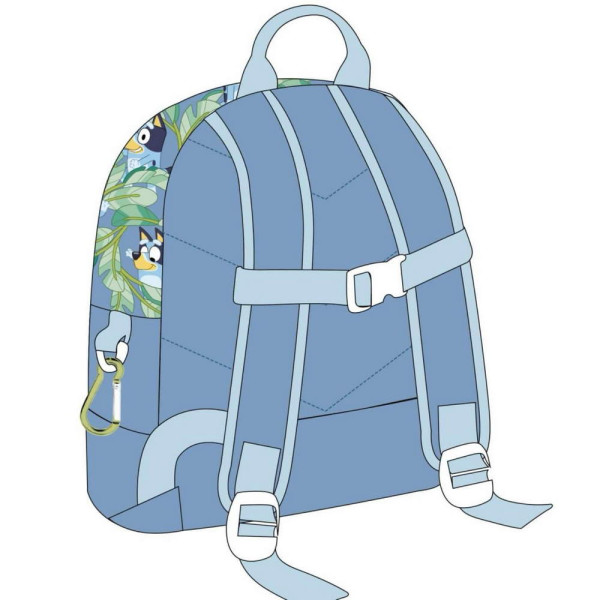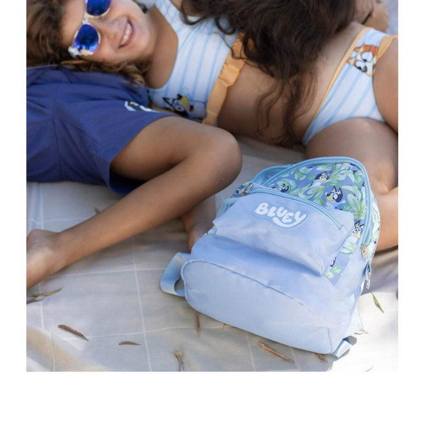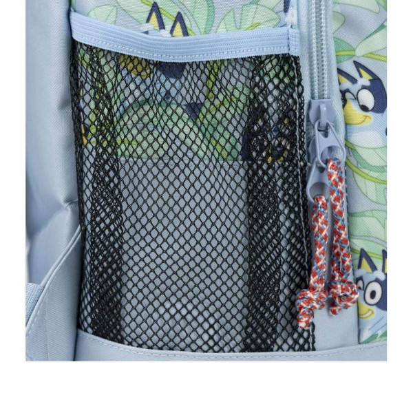 Раница за детска градина Блуи, изработена по европейски дизайн, на испанския производител Cerda. С едно основно отделение с двоен цип, преден джоб с цип, страничен мрежест джоб, подсилено дъно, подплатен гръб, подплатени регулируеми презрамки и дръжка за носене в ръка. Подходящо за момичета и момчета от 1 до 3 години.