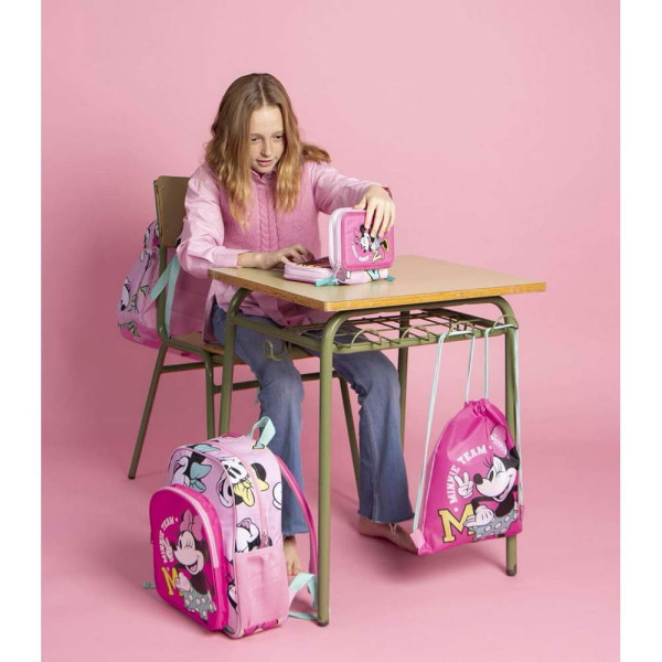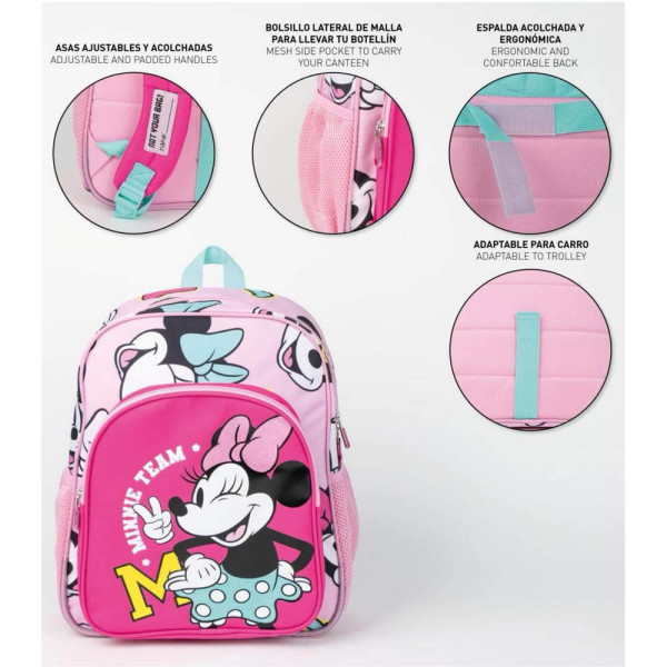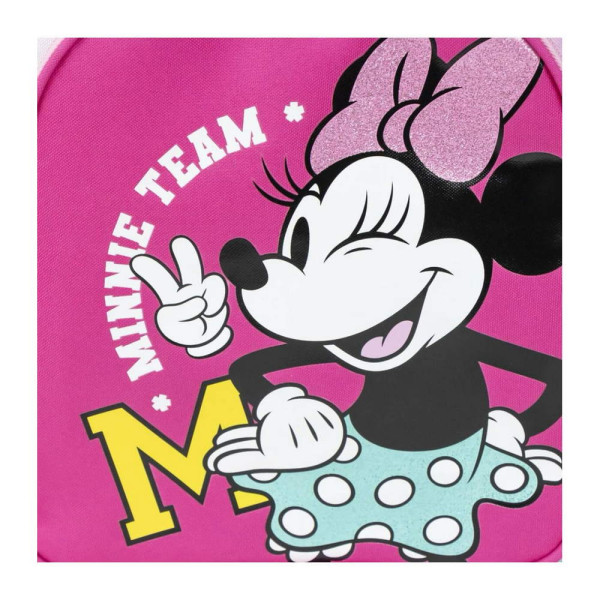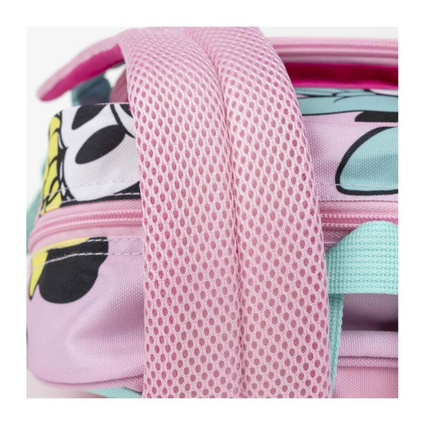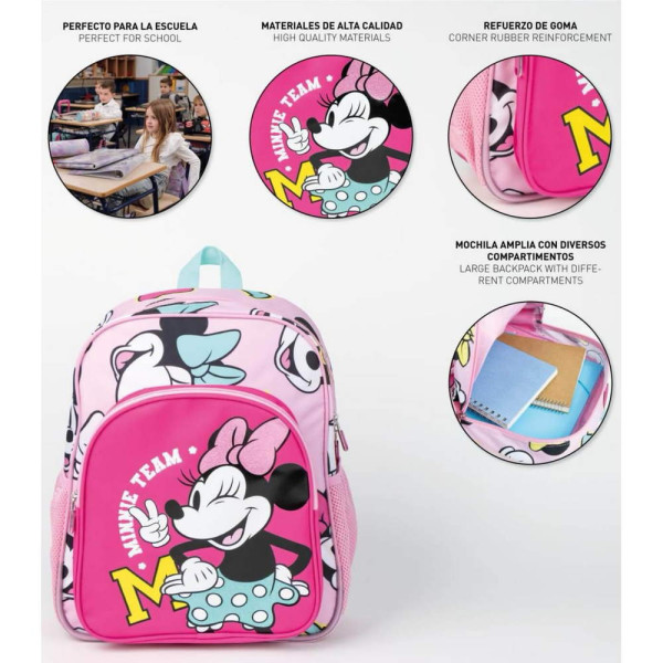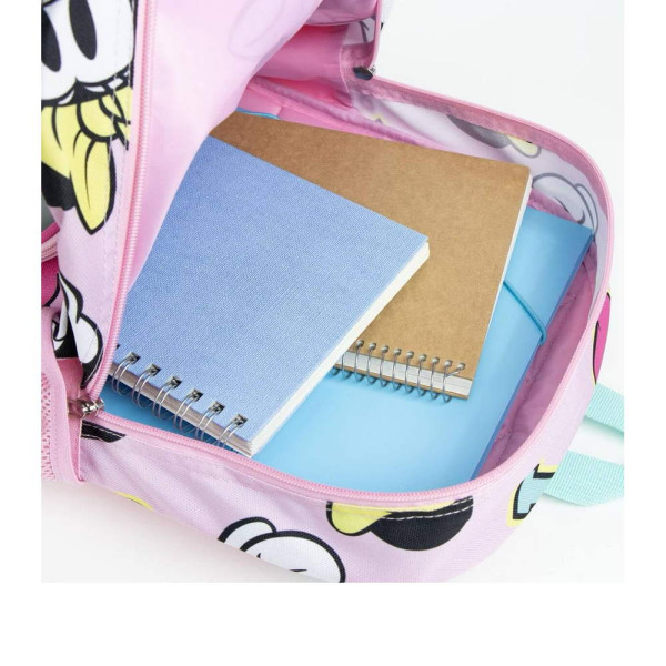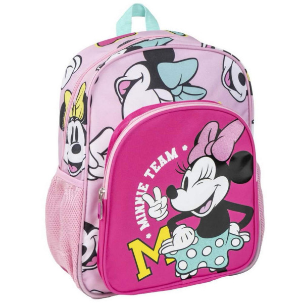 Раница за училище Мини Маус. Изработена по европейски дизайн, на испанския производител Cerda. С едно основно отделение с двоен цип, преден джоб с цип, странични мрежести джобове, подсилено дъно, подплатен гръб, подплатени регулируеми презрамки и дръжка за носене в ръка. Подходящо за момичета от 6 до 13 години.
