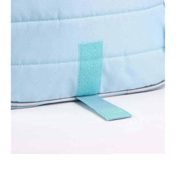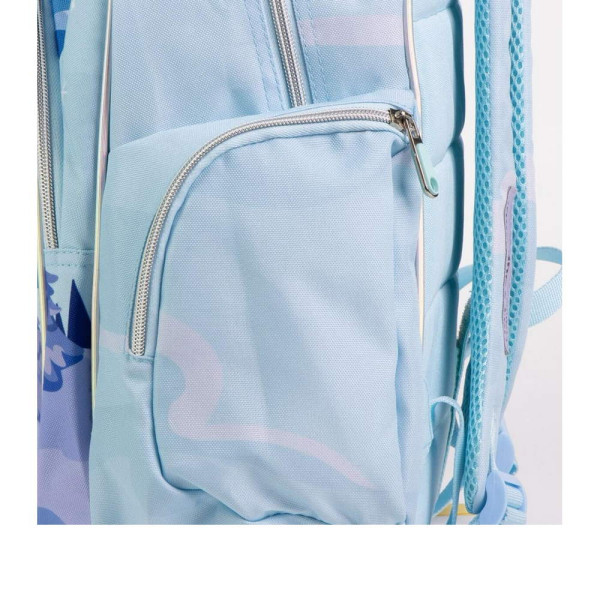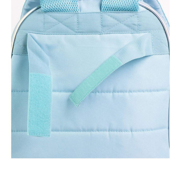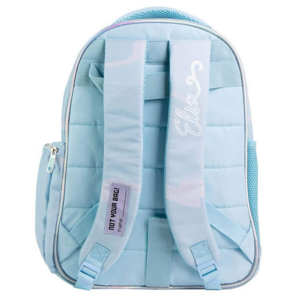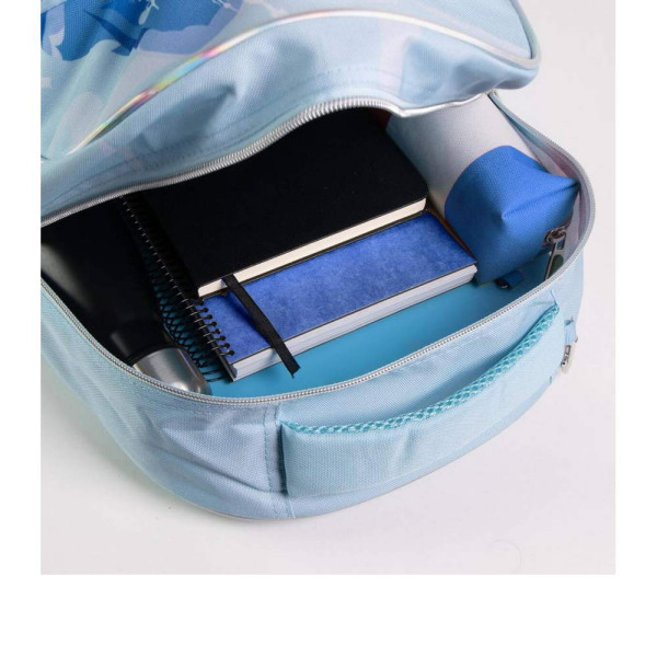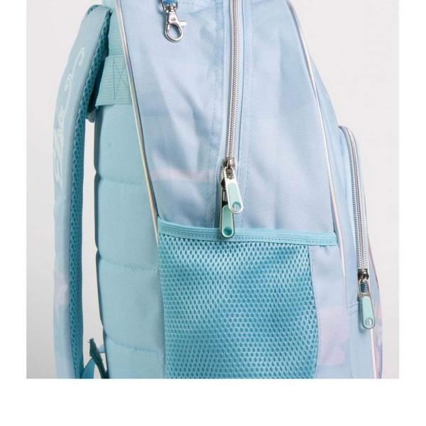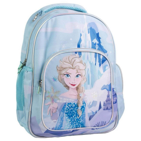 Раница за училище Замръзналото кралство - Елза. Изработена е по европейски дизайн, на испанския производител Cerda. С едно основно отделение с двоен цип, преден джоб с цип и органайзер за ученически пособия, страничен мрежест джоб, страничен джоб с цип, подсилено дъно, подплатен гръб, подплатени регулируеми презрамки и подплатена дръжка за носене в ръка. Подходящо за момичета от 6 до 13 години.