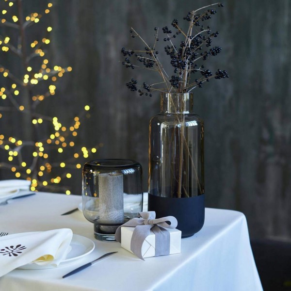 Стъкло в сиво-кафяв оттенък с едва доловима огледална повърхност и матирано черно покритие в долната част на вазата, която е със забележителната височина от 37 см.