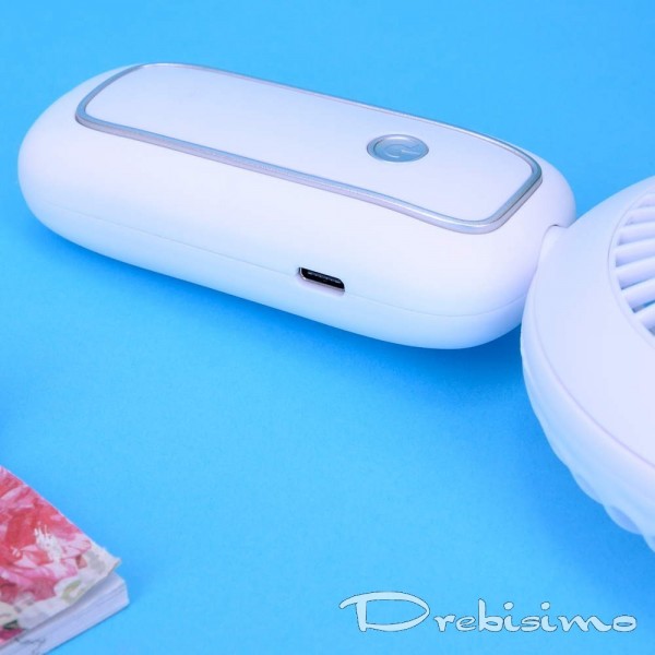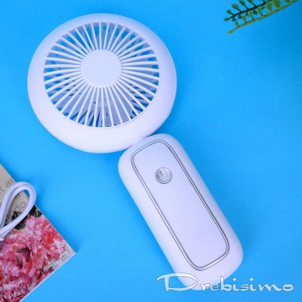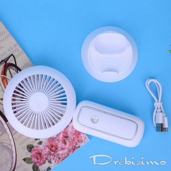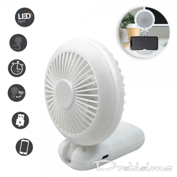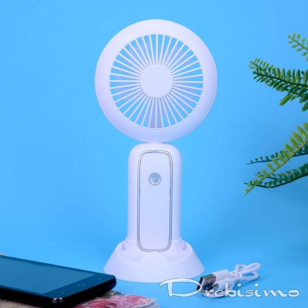 Бял ръчен вентилатор с поставка за телефон и LED осветление