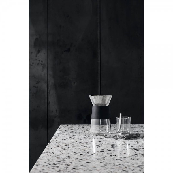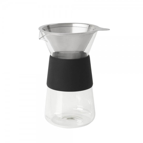 Просто изсипете гореща вода върху смляното кафе във филтъра и се насладете на ароматното кафе. Филтърът, изработен от полирана неръждаема стомана, се използва без хартиен филтър и може лесно да се извади от съда за почистване след употреба. Стъклената кана е с чучур и е с вместимост 0,4 литра. Седи удобно в ръката, благодарение на черното изолиращо силиконово покритие.